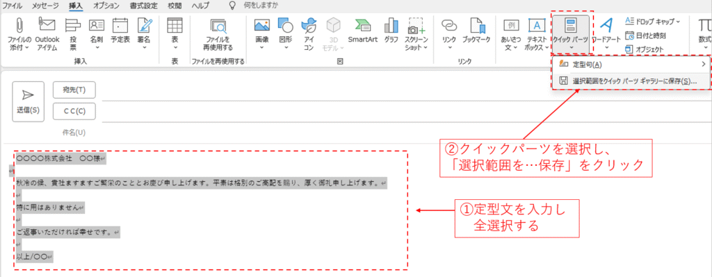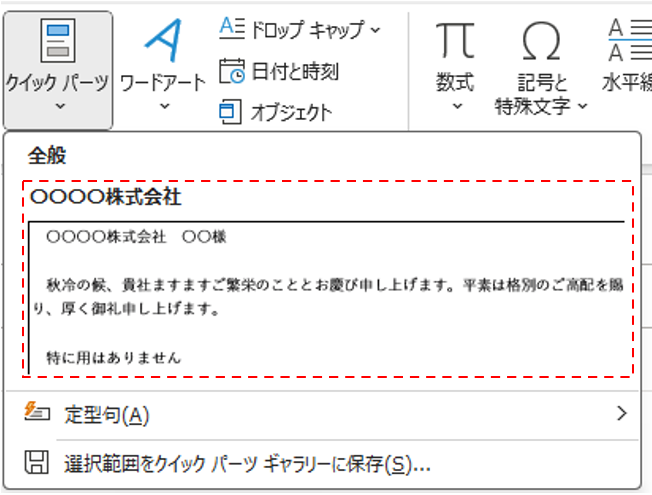 ③クイックパーツをもう一度選択すると、登録した名前・挿入分が選択肢として出てくるのでクリックすると挿入される。