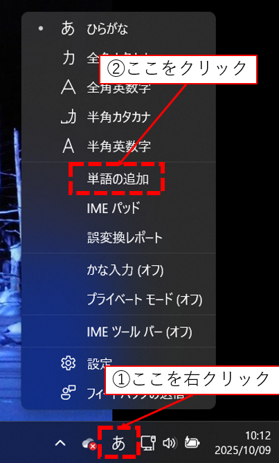 ①パソコンの右下にある『A』や『あ』となっている箇所を右クリックするとメニューが出てくる