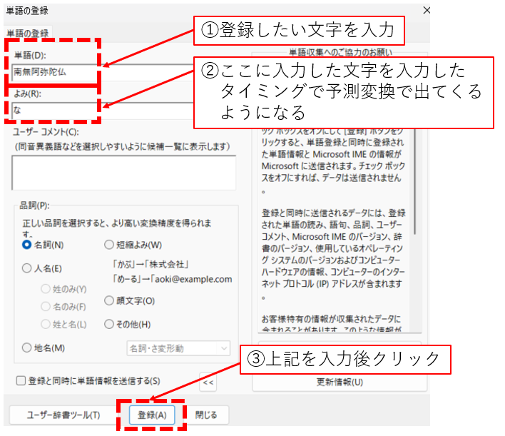 ②以下のウィンドウが出てくるので『単語』と『よみ』部分に登録したい文字を入力する。