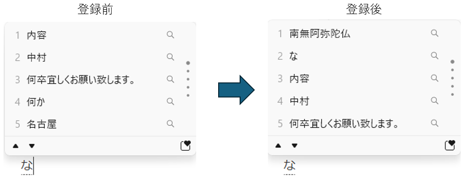 以下の例では『南無阿弥陀仏』という単語を記憶させたく、『な』という一文字を入力しただけで予測ワードに『南無阿弥陀仏』が出てくるようになる