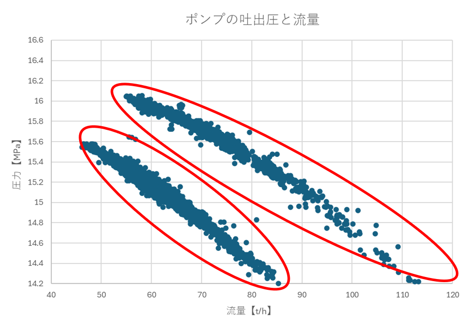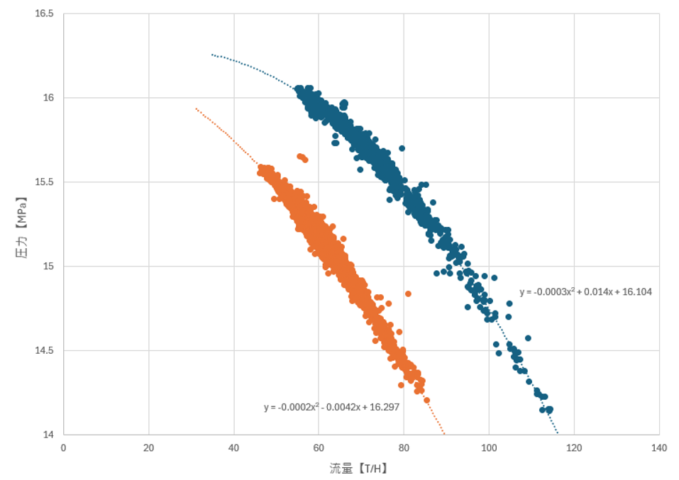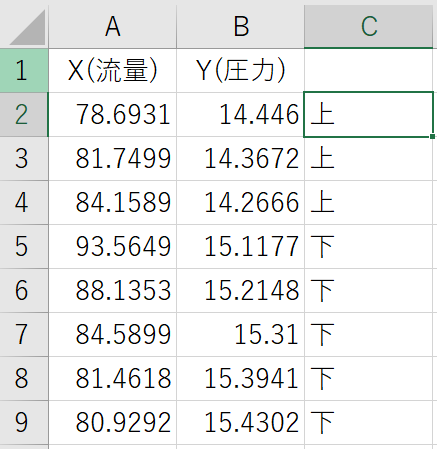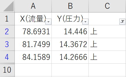 表2は図1の元データの一部です。X軸は流量、Y軸は圧力となっています。