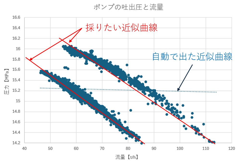 しかしそのまま近似曲線を出すと図2のように採りたい近似曲線とは違う曲線になってしまう。