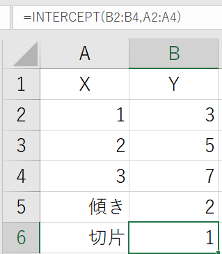 INTERCEPT関数は、y切片(グラフがy軸と交わる点のyの値)を求める関数です。