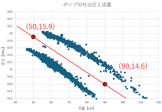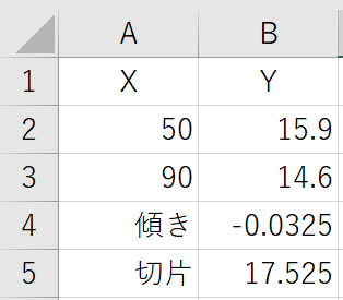 今回の場合は(50,15.9)、(90,14.6)の2点とします。