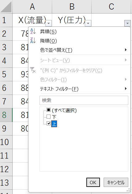 フィルタ機能を使用してC列に”上”と入力されているデータだけを表示させることが出来ます。